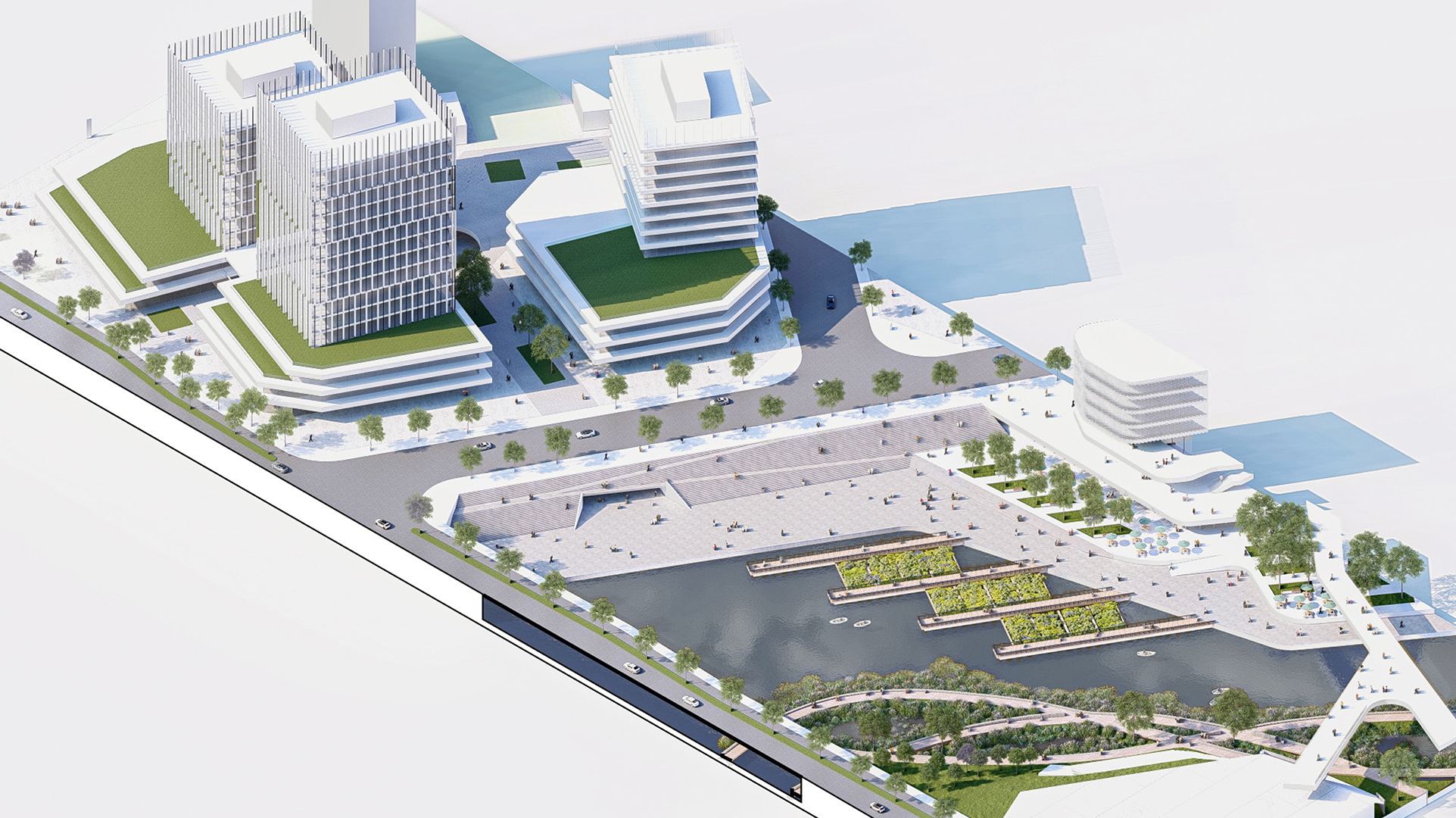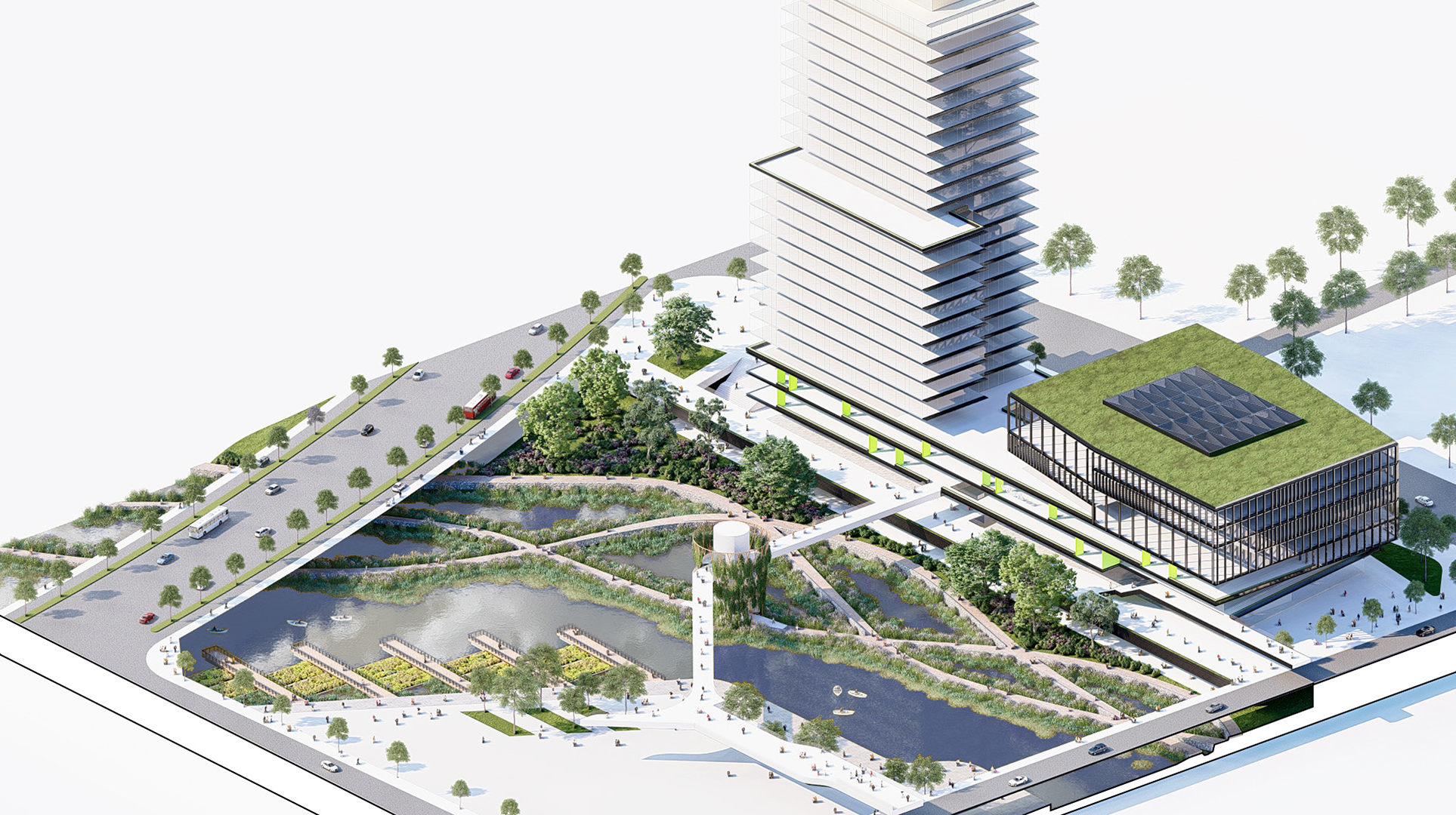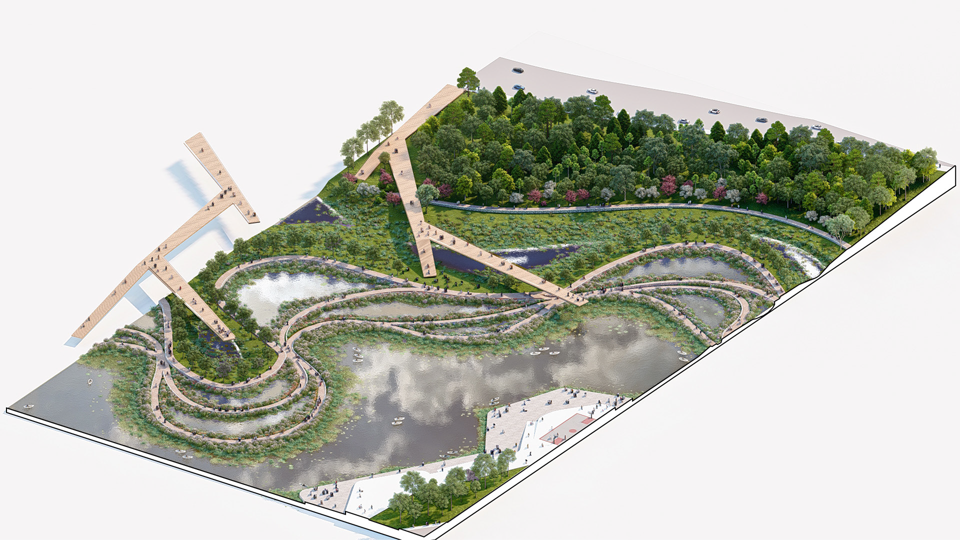 Na margem oeste, o desenvolvimento destaca uma marina com jardins flutuantes, teatro aquático, praça interativa e wetlands inspiradas nas chinampas, combinando usos urbanos com dinâmicas naturais do rio. Já a margem leste propõe um parque inundável em terraços, que atua na mitigação de cheias e oferece uma experiência imersiva de educação ambiental.