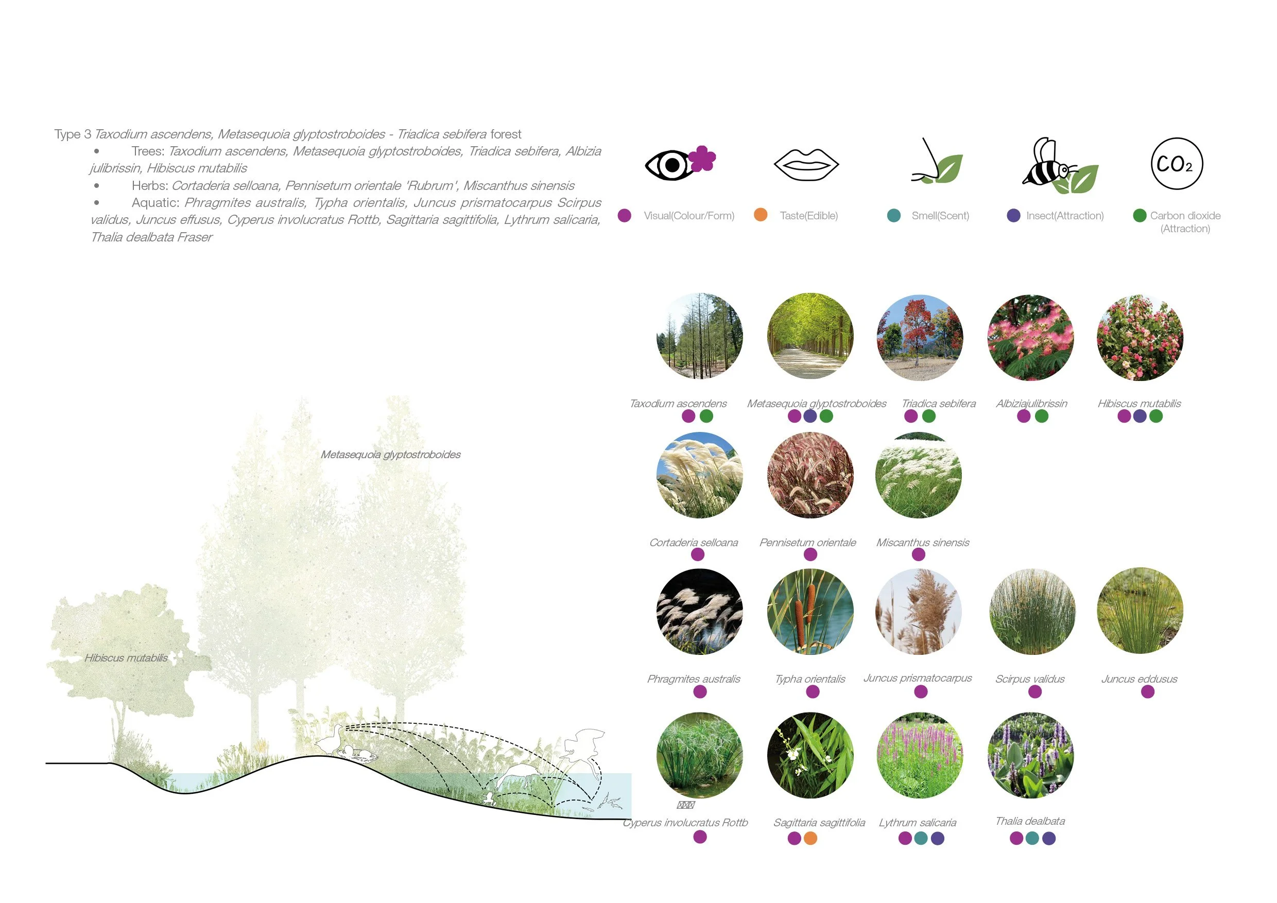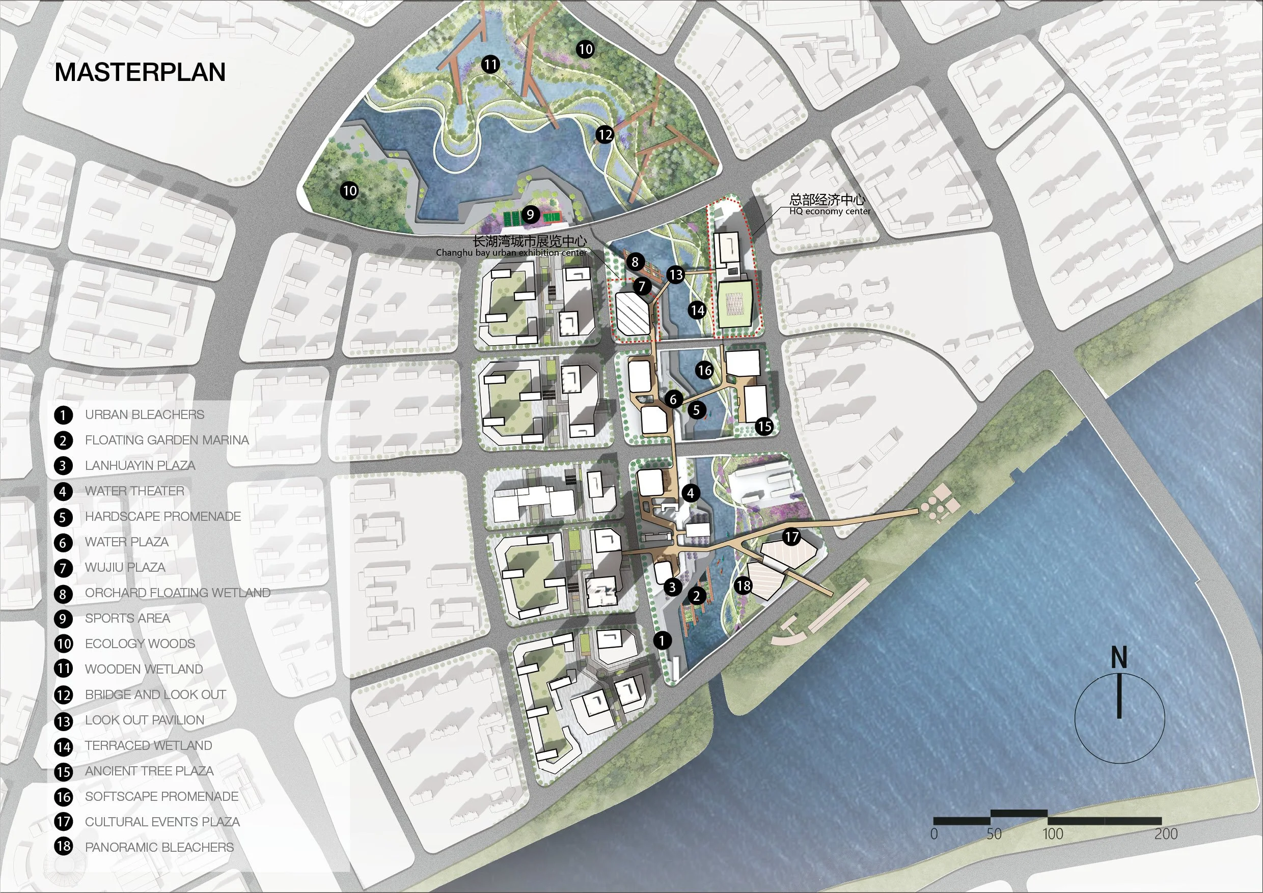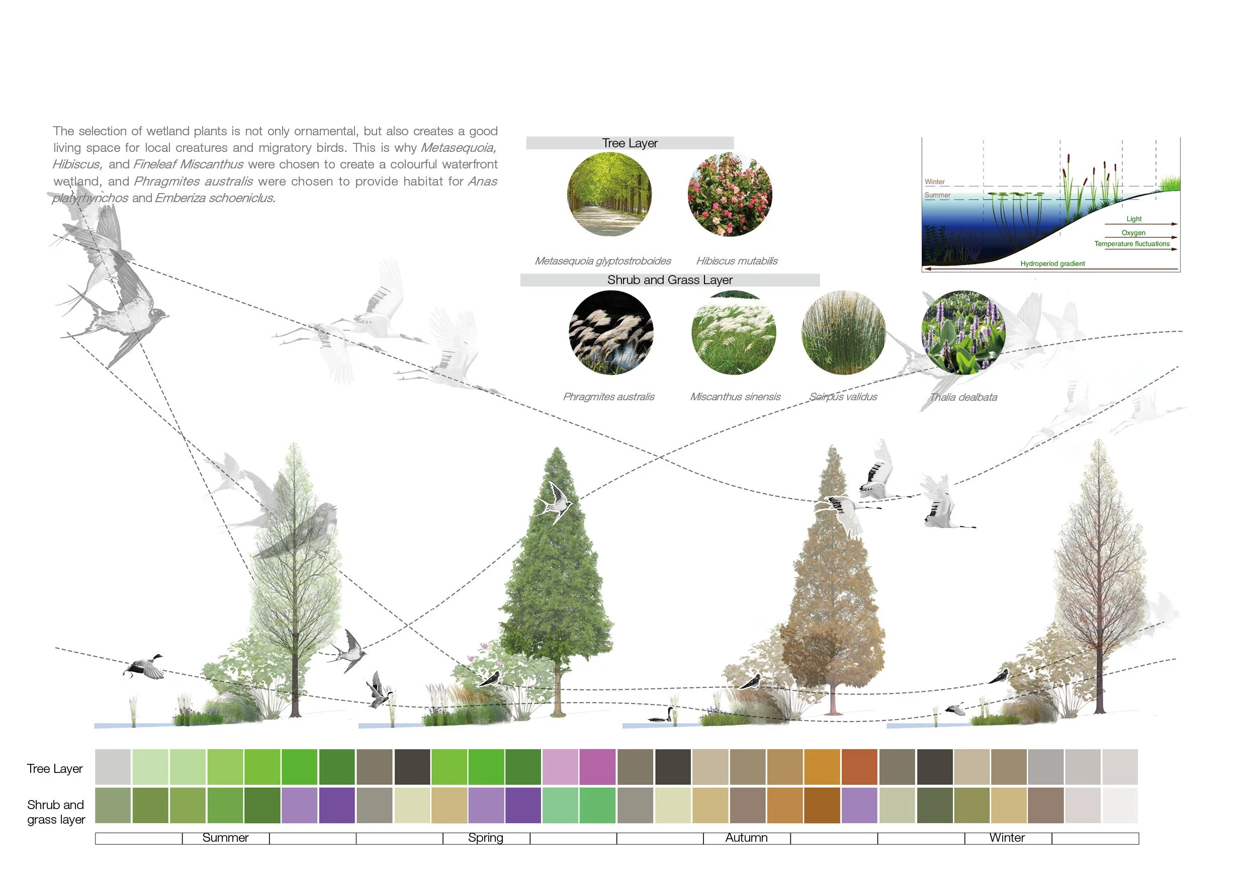 Na margem oeste, o desenvolvimento destaca uma marina com jardins flutuantes, teatro aquático, praça interativa e wetlands inspiradas nas chinampas, combinando usos urbanos com dinâmicas naturais do rio. Já a margem leste propõe um parque inundável em terraços, que atua na mitigação de cheias e oferece uma experiência imersiva de educação ambiental.