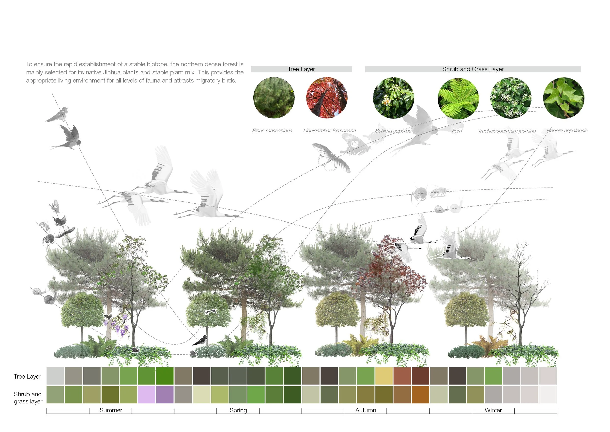 A nova entrada do Parque Changhu, em Jinhua, se estrutura a partir de corredores ecológicos que conectam paisagens naturais e urbanas. O rio Jinhua atua como elemento central, promovendo a dispersão de flora e integrando sistemas agroflorestais ao norte da cidade.