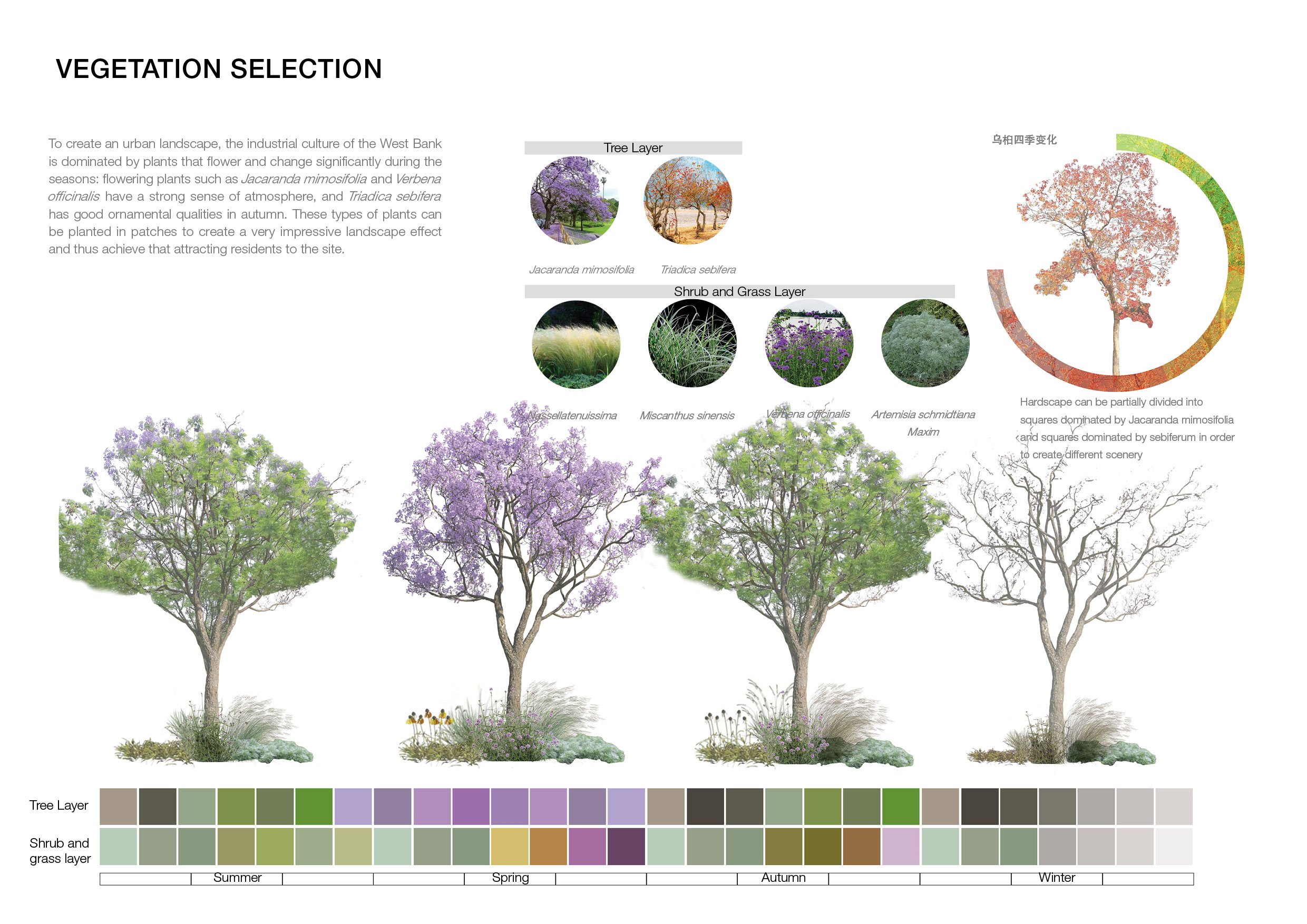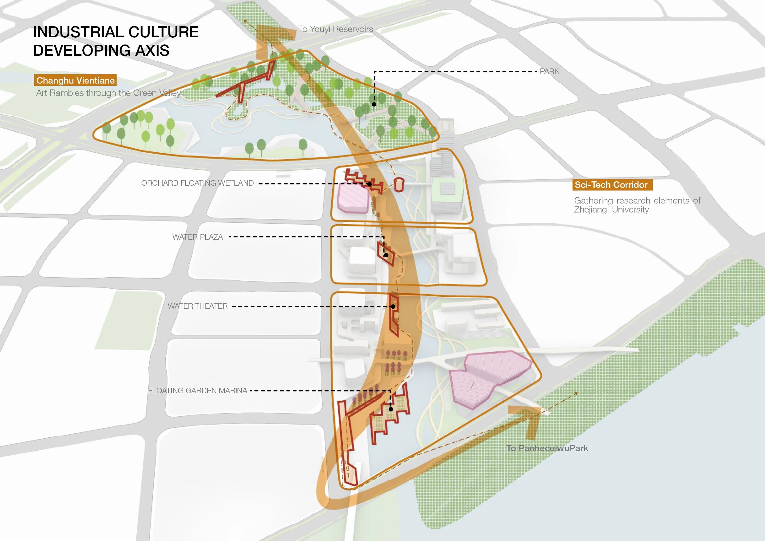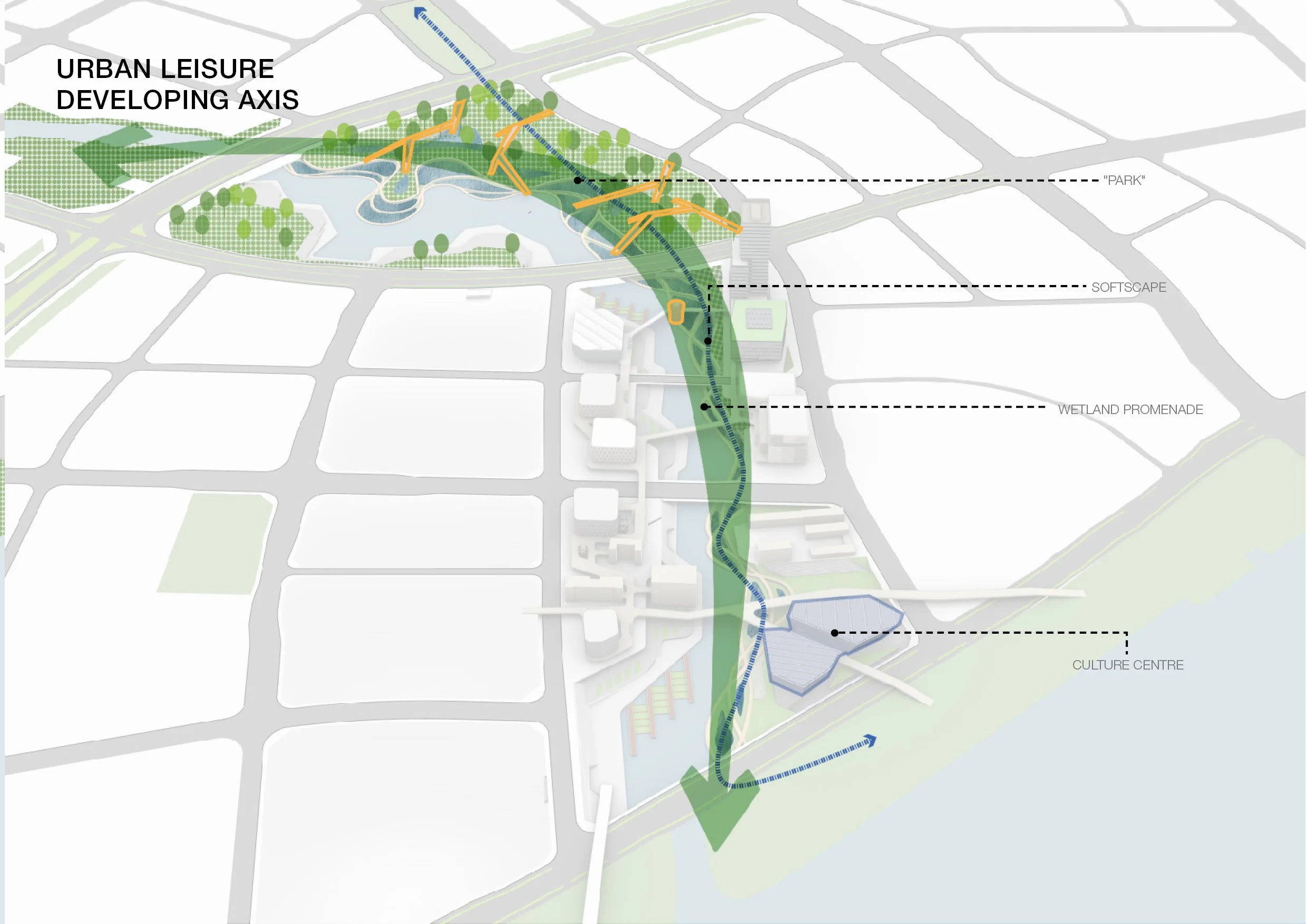 O masterplan articula dois percursos paralelos: um a oeste, voltado à cultura e a valorização do patrimônio e memória industrial do local, e o outro a leste, dedicado ao lazer e potencialização da experiência ecológica dos visitantes. Um eixo complementar, o Eixo Comunidade Verde, integra usos residenciais, comerciais e de inovação, conectados por redes acessíveis e espaços públicos contínuos.
