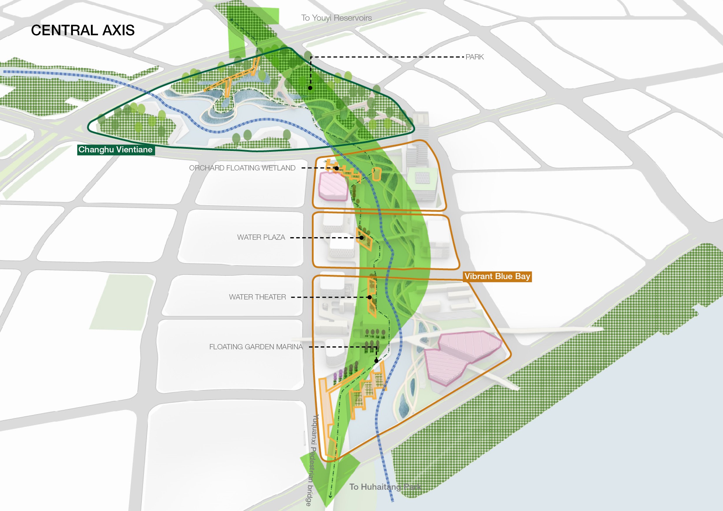 Os dois eixos principais: Eixo Verde (norte-sul) e o Eixo Azul (via navegável), organizam uma rede de infraestruturas ecológicas e espaços públicos.