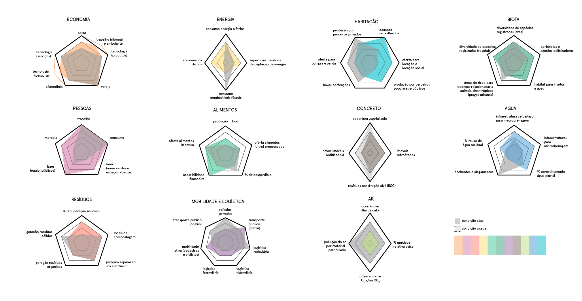 Elaboramos um diagnóstico da situação atual da região, ponderando fluxos, valores e disposição dos seguintes tópicos: economia, pessoas, resíduos, energia, alimentos, biota, transporte, concreto, qualidade do ar, habitação e água.