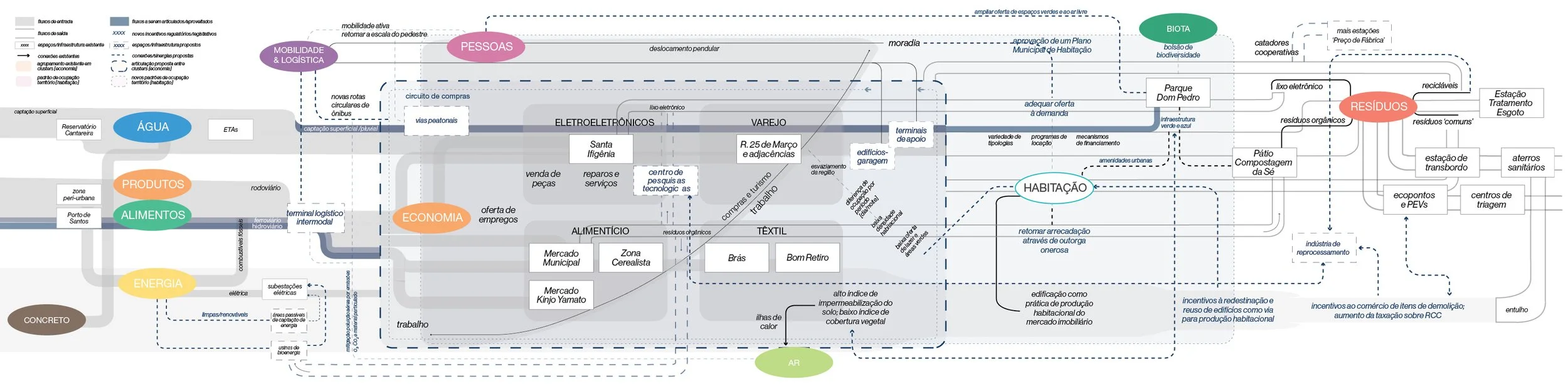 Através do conceito de metabolismo urbano, que descreve a interação desses fluxos como um sistema orgânico, pudemos traçar diretrizes e elaborar um ponto de partida para a proposta de transformação da região